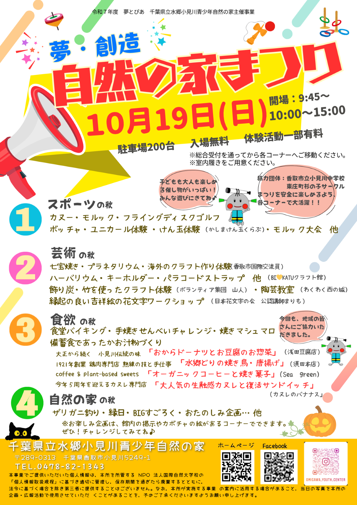 カヌーやプラネタリウムなどここでしかできない体験活動や、地域の方を講師に招いた様々なプログラムを1日体験しよう! ※詳細はホームページ・Instagramをご覧ください。 - 2025年10月25日(土)